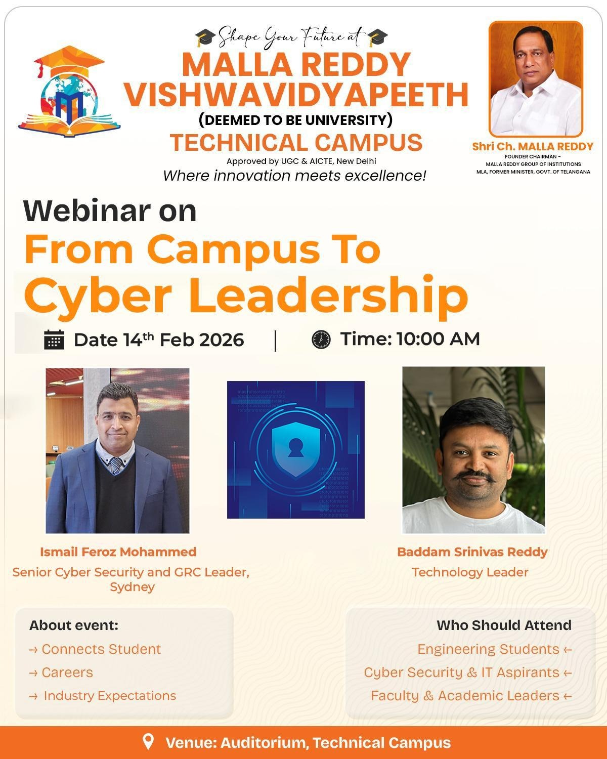 The Webinar was successfully conducted at Malla Reddy Technical Campus (MRTC), A constituent unit of Malla Reddy Vishwavidyapeeth (Deemed to be University), on February 14, 2026 at 10.00 A.M. The session brought together students, faculty members, and industry experts to discuss career opportunities in cybersecurity, governance, risk management, and leadership roles in the IT sector. The webinar provided a platform for students to understand how to transition successfully from campus life to professional leadership positions in the cyber domain.