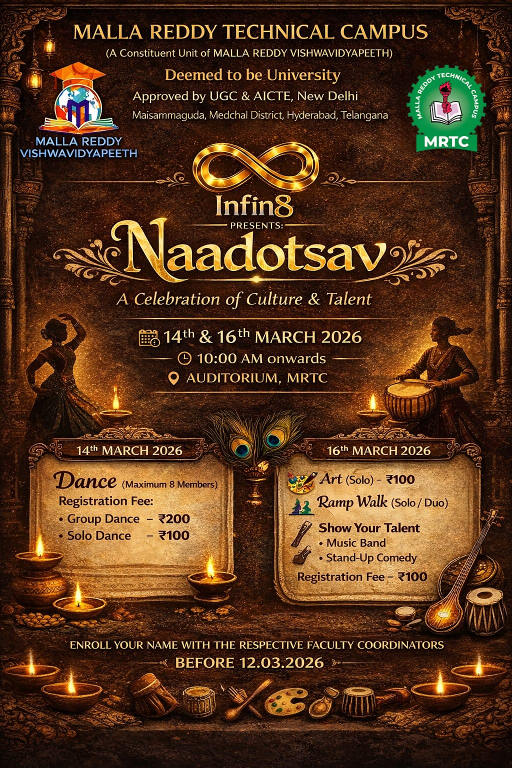 The Event titled Naadotsav 2026 – Cultural Festival was conducted at Malla Reddy Technical Campus (MRTC), A Constituent unit of Malla Reddy Vishwavidyapeeth (Deemed to be University), on 14th & 16th February 2026 at Auditorium 10.00 A.M. onwards. The event was conducted under the banner of the Infin8 Student Club, which actively coordinated and organized the festival with the support of faculty coordinators. The event included a variety of competitions and performances such as Dance, Art, Ramp Walk, Music Band Performances, and Stand-up Comedy.
